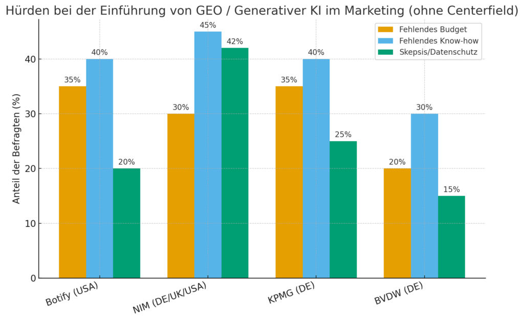 Die Auswertung internationaler Studien macht klar: Unternehmen sind für GEO noch nicht gerüstet – in den USA fehlt das Budget, in Europa dominiert der Mangel an Know-how, ergänzt durch ausgeprägte Skepsis.